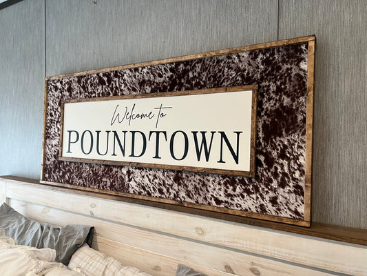 Welcome to poundtown - cowhide wooden sign - cowhide sign - over the bed decor - bedroom decor -
